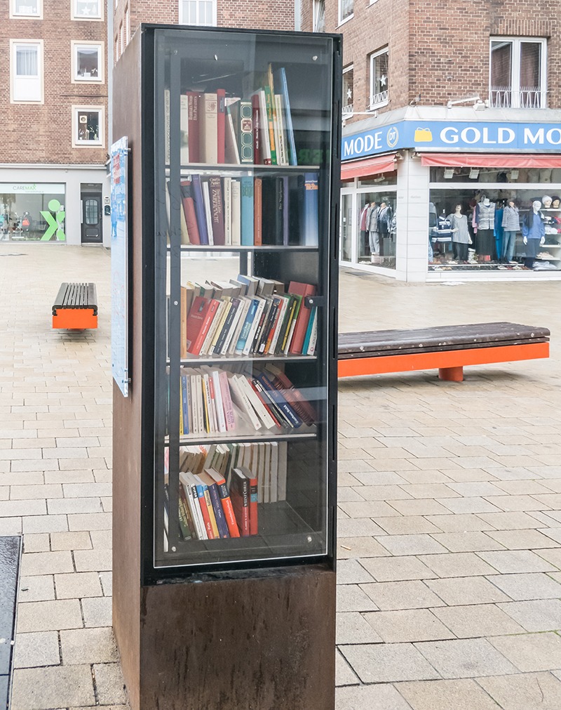 Ein guter Platz, denn die Bänke in der unmittelbaren Umgebung laden ein, zum Verweilen und zum Schmökern. Der Schrank der ist bestückt mit Büchern, die frei verfügbar und ohne Bezahlung rund um die Uhr entnommen, getauscht oder durch eigene Bücher ergänzt werden können.
